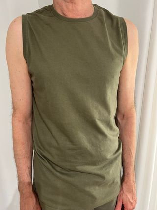 Camiseta color verde oliva de hombre, sin mangas, de tirante grueso, marca 3 Suisses, larga, talla S, en perfecto estado, como nueva. 100% algodón. Cómoda y fresca. 📏 Medidas: Largo 80 cm Ancho 48 cm