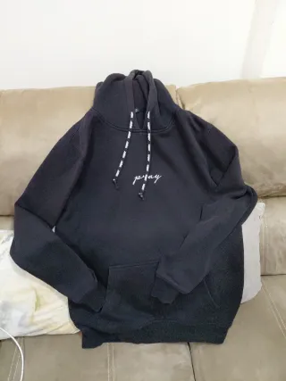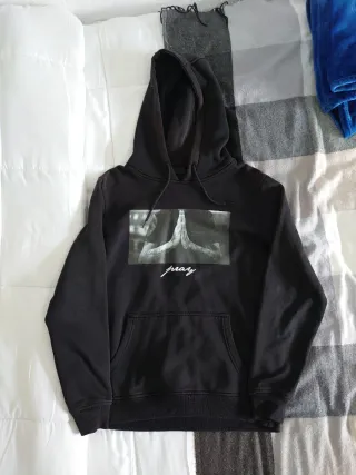 Sudadera con capucha y un diseño moderno. - Estampado pray en el pecho. - Cordones blancos con detalles negros en la capucha. - Bolsillo frontal tipo canguro.