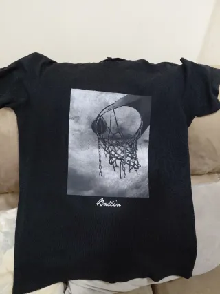 Camiseta negra con un diseño gráfico de una canasta de baloncesto y la palabra Ballin. - Estampado frontal. - Cuello redondo. - Manga corta.