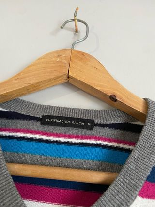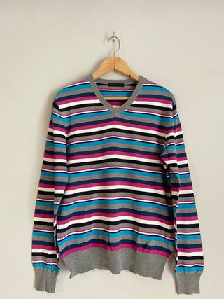 Suéter de rayas con cuello en V. - Diseño de rayas multicolor. - Manga larga. - Puños y bajo acanalados.
