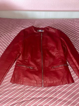 Chaqueta de cuero sintético en color rojo, con cuello redondo y cierre de cremallera frontal. Presenta bolsillos con cremallera en la parte delantera. - Diseño moderno y versátil. - Material: Cuero sintético.