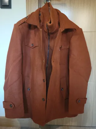 Abrigo de hombre con diseño moderno y elegante. - Mangas de efecto piel. - Cierre de botones. - Bolsillos frontales. - Cremallera decorativa en el pecho.