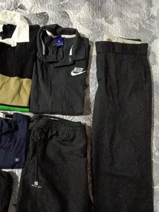 Conjunto de varias prendas de vestir para hombre en talla M. - Camisa polo negra con logo Nike. - Pantalón Dickies gris oscuro. - Pantalón deportivo Domyos negro. - Camiseta azul marino con logo.