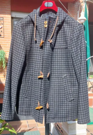 Trenca de cuadros en tonos grises y negros. Cierre con botones y tancas de madera. - Diseño con capucha. - Bolsillos frontales. - Detalle de cordones en la capucha.