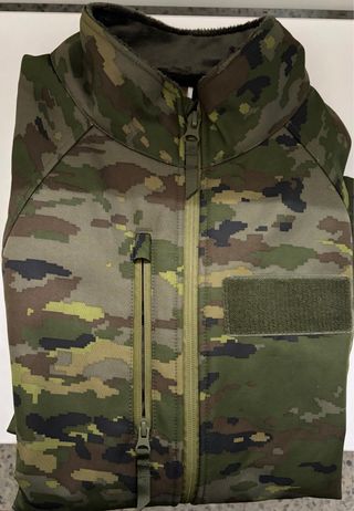 Forro polar con estampado de camuflaje en tonos verdes y marrones. - Diseño de camuflaje digital. - Cremallera frontal. - Bolsillo con cremallera en el pecho. - Parche de velcro en el brazo.