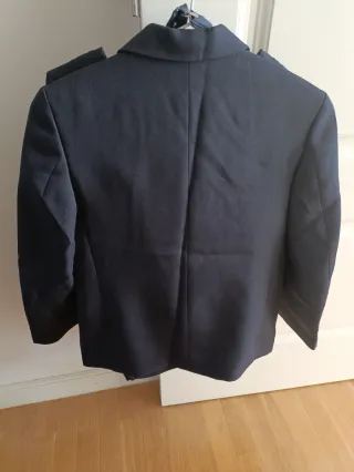Traje de comunión de color azul marino con adornos dorados. - Chaqueta con hombreras y puños decorados. - Cordón dorado cruzado sobre el pecho. - Escudo bordado en la solapa. - Botones redondos a juego.
