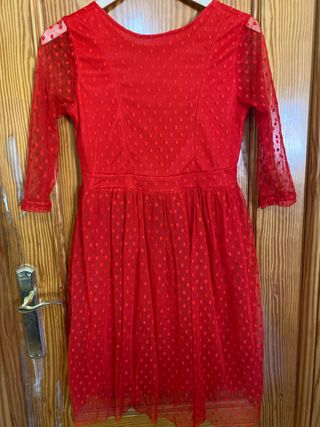 Vestido elegante con un diseño de encaje.Medidas:Hombros:37cm -Axila:42cm , Cintura:40cm ,Largo:88cm - Mangas largas de encaje. - Falda con vuelo. - Detalle de lunares.