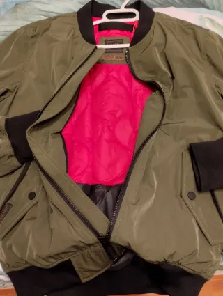 Cazadora bomber de color verde, con forro interior llamativo. - Cierre de cremallera. - Puños y cuello elásticos. - Bolsillos laterales con botón.