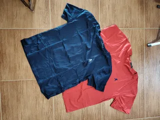 Conjunto de dos camisetas para hombre, una en color negro y otra en color rojo. Ambas presentan un pequeño logo bordado en el pecho. - Camiseta negra con cuello redondo. - Camiseta roja con cuello redondo. - Tejido satinado.