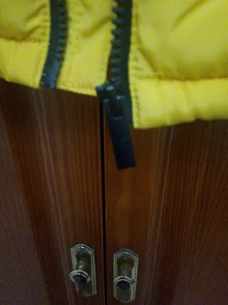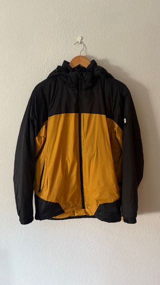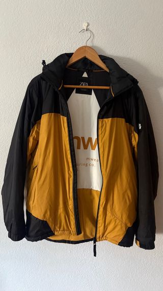 Abrigo de Zara en dos tonos. - Combinación de colores amarillo y negro. - Capucha integrada. - Cierre de cremallera frontal. - Bolsillos laterales con cremallera.
