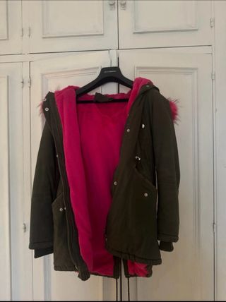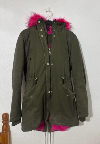 Abrigo con un diseño moderno y llamativo, perfecto para añadir un toque de color a tu vestuario. - Capucha con detalle de pelo sintético. - Forro interior de color vibrante. - Cierre frontal con cremallera y botones. - Bolsillos laterales. - Cordón ajustable en la cintura.