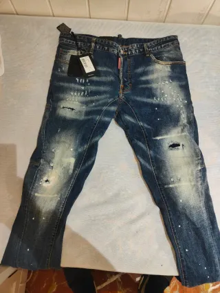 Pantalón vaquero de la marca Dsquared2 con un diseño moderno y desgastado. - Color azul con detalles blancos. - Estilo desgastado y con rotos. - Acabado con salpicaduras blancas. Equivale a una 42. Nuevo con etiqueta