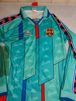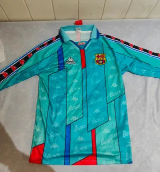Camiseta de fútbol vintage del FC Barcelona de los años 90. - Diseño icónico con colores vibrantes. - Logo de Kappa y escudo del club. - Mangas largas.