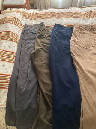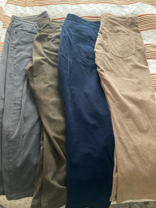 Conjunto de cuatro pantalones de pana en diferentes tonalidades. - Pantalón de pana gris. - Pantalón de pana marrón. - Pantalón de pana azul marino. - Pantalón de pana beige.