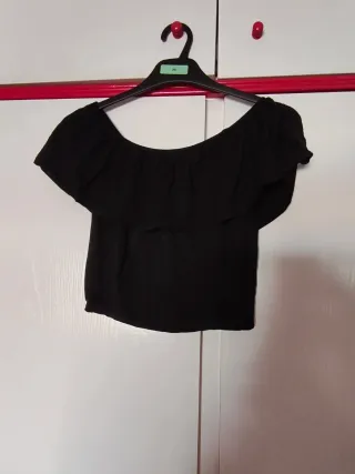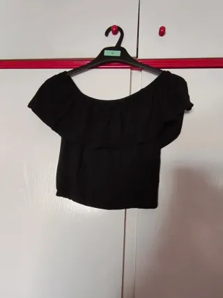 Top negro con diseño de hombros descubiertos. Ideal para un look moderno y fresco. - Corte fruncido en el escote. - Mangas cortas tipo volante.