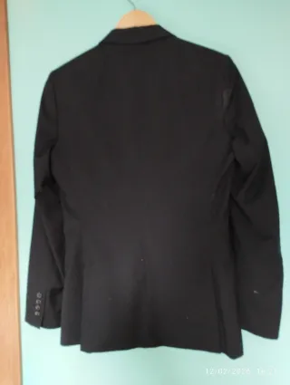 Elegante traje negro para hombre, talla 46. El pantalón es de la talla 44. Esta en buenas condiciones. Pero la chaqueta tiene una mancha en la espalda junto a la manga derecha. Ver foto ampliada. Por eso el precio tan bajo. El pantalón mide 1 m de largo y 40 de cintura. - Corte clásico. - Dos botones frontales. - Bolsillos de solapa. - Puños con botones.