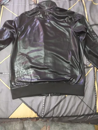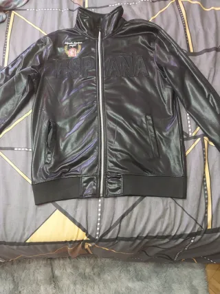 Chaqueta deportiva con diseño de España y escudo. - Cremallera frontal. - Cuello alto. - Bolsillos laterales. Negro con brillo grabado de españa por delante letras y en escudo por detrás muy original 55 cms de axila a axila y 70 cms de larga Negro brillante en muy buen estado
