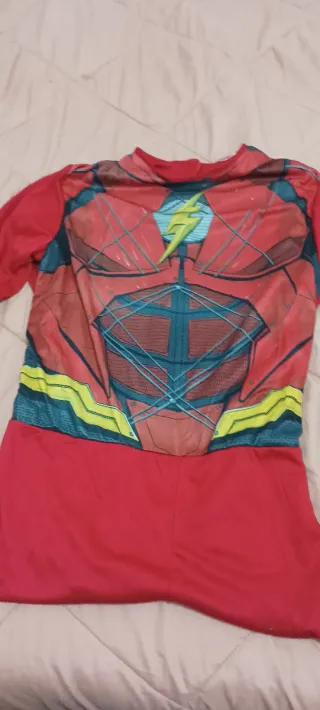 Disfraz inspirado en el personaje de Flash. - Diseño con el rayo característico en el pecho. - Detalles que simulan la armadura del personaje. - Cinturón con detalles amarillos y azules.