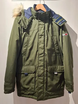 Parka de hombre de la marca Tommy Hilfiguer Jeans en color verde. Ideal para el frío. Esta como nueva, talla L, solo usada 3 o 4 veces, se compró al final del invierno pasado y este he cambiado de talla y no me vale. Costó 193€ y la vendo casi a la mitad 110€ - Capucha con pelo. - Bolsillos frontales. - Cierre de cremallera y botones. - Puños ajustables. #Talla L #Abrigo #Verde #hombre