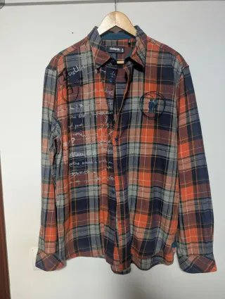 Camisa de manga larga con estampado a cuadros y detalles gráficos. - Diseño a cuadros en tonos naranjas, azules y grises. - Estampado de texto y figuras gráficas. - Cuello camisero y cierre de botones.
