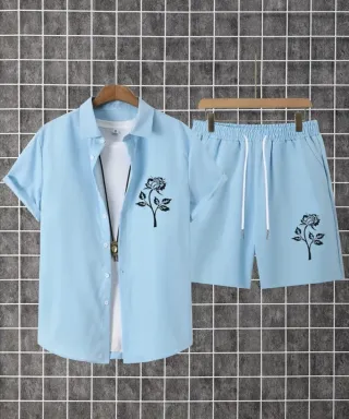 Conjunto de camisa de manga corta y pantalones cortos con un diseño de rosa. - Camisa con cuello - Cintura elástica en los shorts - Estampado de rosa en ambas prendas