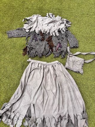 Este traje de estilo medieval pobre es perfecto para disfraces o representaciones. - Diseño desgastado y rasgado. - Incluye chaqueta y falda. - Pequeño bolso de hombro a juego.