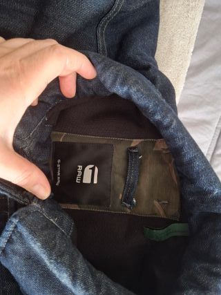 Abrigo vaquero de la marca G Star para hombre, en color azul. Poco usado. - Diseño clásico. - Cierre de botones. - Bolsillo interior. -Detalles camuflaje.
