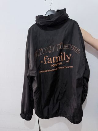 Anorak original Filling Pieces de la colección Spring/Summer 2020. Chaqueta ligera tipo cortavientos con capucha, cierre corto frontal y bolsillo delantero. Logo pequeño en el pecho y print grande “family forever” en la espalda. Muy ligera y cómoda, ideal para primavera/verano o estilo streetwear minimalista. • Talla: XL • Color: negro / gris oscuro • Material: 100% poliamida • Fabricado en Portugal • Estado: bueno, con señales normales de uso (ver fotos)