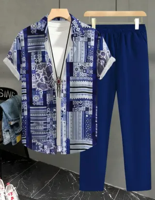 Conjunto de verano para hombre, ideal para lucir fresco y a la moda. - Camisa de manga corta con estampado geométrico. - Pantalón largo de corte recto. - Incluye collar con colgante.