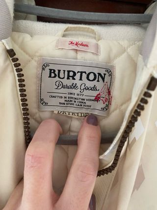 Abrigo Burton de color beige, ideal para el frío. Presenta un diseño moderno y funcional. - Capucha con pelo sintético. - Estampado de rombos en la parte superior. - Bolsillos frontales con cremallera. - Cierre principal con cremallera y botones. - Puños ajustables. - Unicos defectos los que se aprecian en la foto unas pequeñas marcas que se quitan lavandolo