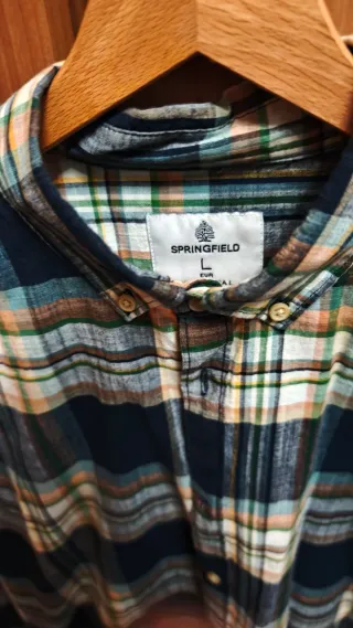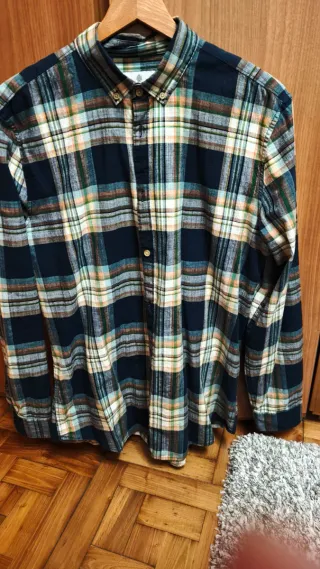 Cazadora con un diseño a cuadros en tonos azules y negros. Con capucha y cierre de botones y cremallera. Puños y bajo elásticos. Talla XL (talla pequeño) Marca Pull & Bear. Desgaste en color de botones como se muestra en las imágenes. Medidas: - Largo: 70 cm - Hombro: 44 cm - Axila: 54 cm Posibilidad de envío.