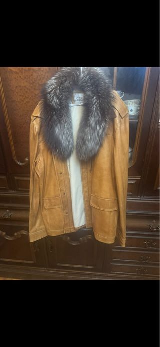 Elegante abrigo de piel para hombre con un distintivo cuello de pelo. - Material exterior: Piel. - Color: Beige y marrón. - Diseño con cuello de pelo, se puede quitar