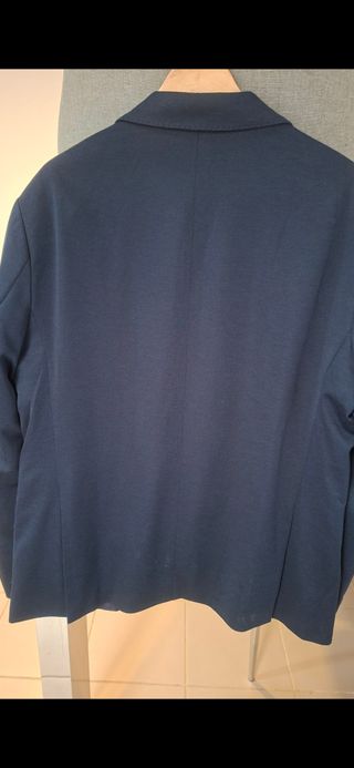 Americana impecable, color azul marino, un solo uso, corte estilizado y tejido de microestructura. Ideal para eventos o trabajo. Precio en tienda 169 €.