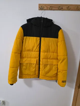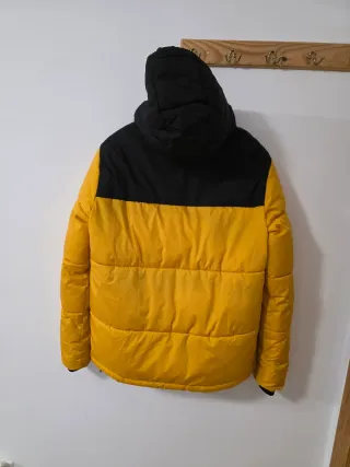 Chaqueta acolchada con diseño bicolor, ideal para el frío. - Parte superior negra. - Parte inferior y mangas amarillas. - Dos bolsillos frontales con solapa. - Capucha integrada. - Cierre de cremallera frontal.