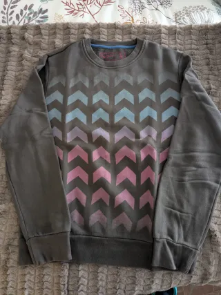 Suéter de la marca Pepe Jeans en talla L. Presenta un diseño moderno con un degradado de colores. - Diseño de chevrón en tonos azulados, rosados y grises. - Cuello redondo y mangas largas.
