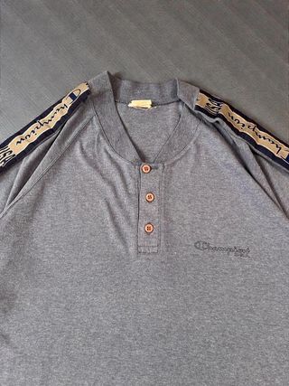 Camiseta tipo polo con un diseño de rayas en tonos grises y azules. Cuenta con cuello clásico y tres botones. Talla XL de hombre . En buen estado . Manga corta . - Cuello de canalé. - Bolsillo en el pecho.