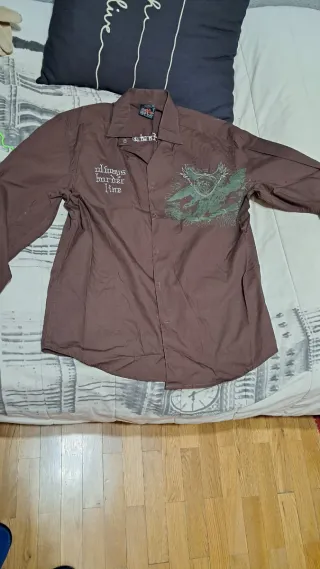 Camisa de manga larga para hombre con un diseño estampado en la parte delantera. - Color marrón. - Estampado verde con diseño de águila y escudo. - Cuello camisero. - Cierre de botones.