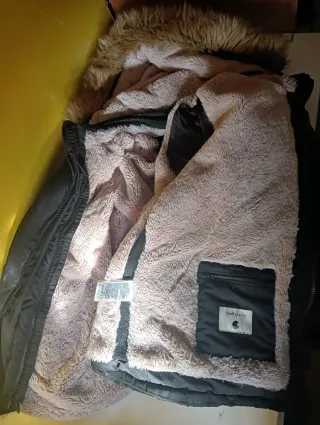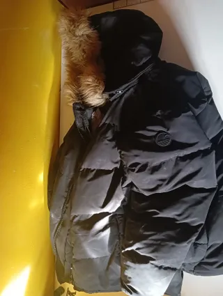 Abrigo de hombre con capucha. - Capucha con pelo. - Cierre de cremallera. - tiene dos cremalleras pero solo funciona la de fuera la otra hay que cambiarla por eso ese precio lo demás perfecto.