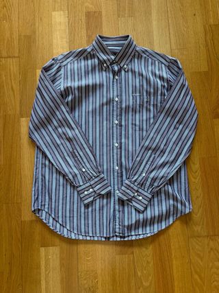 Camisa de manga larga con un diseño de rayas verticales en tonos azules y púrpuras. - Cuello con botones. - Bolsillo en el pecho. - Puños abotonados.