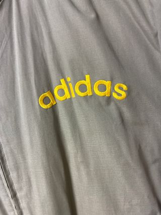 Chaqueta deportiva Adidas en talla M para hombre. Presenta un diseño en color verde con detalles en beige. - Diseño con las tres rayas icónicas de Adidas en las mangas. - Logo de Adidas en la parte frontal. - Cremallera completa. - Bolsillos laterales.