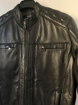 Chaqueta de cuero con un diseño moderno y detalles únicos. - Material: Cuero genuino. - Cierre frontal de cremallera. - Bolsillos con cremallera en el pecho. - Cuello redondo. - Diseño acolchado en hombros y mangas.