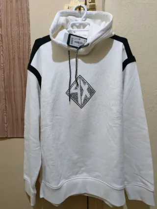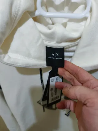 Sudadera de hombre con etiqueta, sin estrenar. Diseño moderno y cómodo. Magnífica prenda de la marca prestigiosa Armani exchange con logo tipo en el pecho de relieve con un cosidos de lujo estás son de la mas alta calidad de Armani exchange poreso son tan caras color blanco oscuro muy bonita - Color blanco. - Detalle de bandas negras en los hombros. - Capucha con cordones. - Estampado central en forma de rombo.