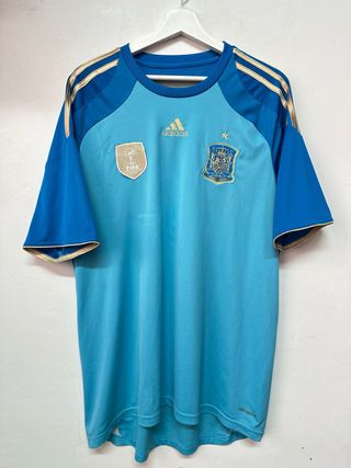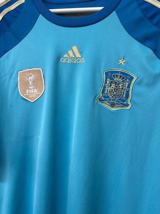 Camiseta de la selección española de fútbol. - Diseño con detalles dorados en hombros y mangas. - Escudo de España y logo de Adidas bordados. - Parche de campeón del mundo FIFA 2010.