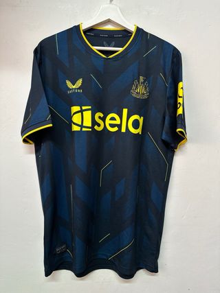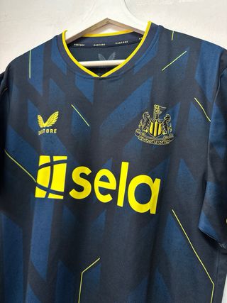 Camiseta deportiva con un diseño moderno y llamativo. - Cuello redondo con ribete amarillo. - Mangas cortas con puños amarillos. - Estampado geométrico en tonos azules y líneas amarillas. - Logo de la marca en el pecho.