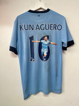Camiseta del Manchester City con el dorsal 10 y el nombre de Kun Agüero. - Diseño con imagen del jugador. - Color azul.