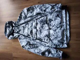 La cbaqueta es negociable. Chaqueta de nieve impermeable con un diseño de camuflaje moderno en tonos grises y blancos. Cuenta con capucha y múltiples bolsillos. - Diseño de camuflaje geométrico. - Capucha ajustable. - Bolsillo canguro frontal. - Bolsillos laterales con cremallera. - Mangas elasticas.
