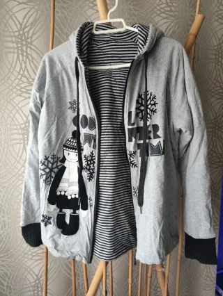 Abrigo gris con un divertido diseño invernal. - Estampado de muñeca y copos de nieve. - Capucha. - Cierre de cremallera. - Puños y bajo elásticos.
