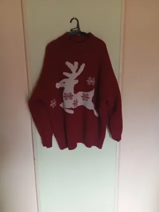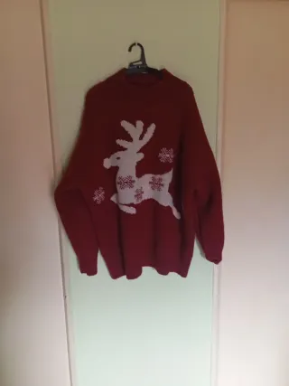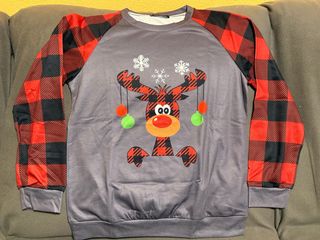 Sudadera con estampado navideño de un reno. - Mangas con estampado de cuadros rojos y negros. - Diseño de reno con adornos colgantes. - Copos de nieve decorativos en la parte superior. - Tejido fino. -Talla M. - Sin uso.