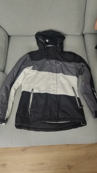 Chaqueta de nieve con diseño a rayas en varios colores. Ideal para actividades al aire libre. - Capucha ajustable. - Cremalleras en los bolsillos laterales. - Puños ajustables. - Talla L niño - Talla S/M mujer adulta