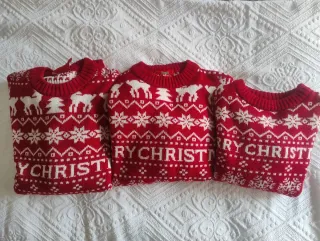 Conjunto de tres jerseys navideños con un diseño festivo. 12€/unidad sueltos, 30€ los 3 - Jersey de punto con estampado de renos y copos de nieve. - Frase Merry Christmas en la parte inferior. - Cuello redondo y manga larga.